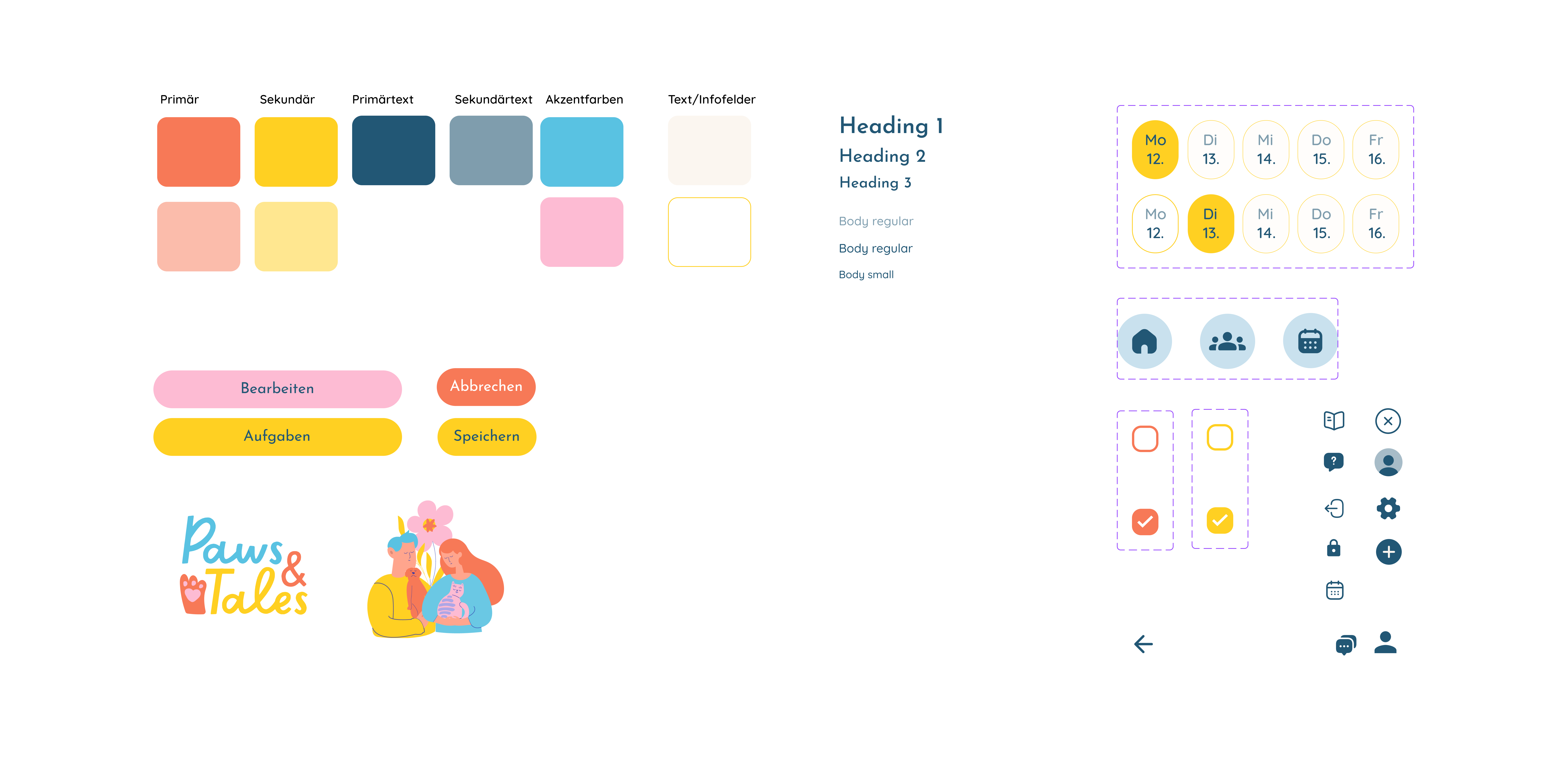 To establish a direction for the design of Paws & Tales, a moodboard was created with the aim of conveying a sense of visual language, fonts, and colors. In the design process, a deliberate selection was made of a palette featuring cheerful and inviting colors to foster a friendly atmosphere. This color scheme is intended to imbue the app with a family-friendly and simultaneously playful character. The moodboard was developed to convey this mood and establish a connection with the user experience, which highlights handcrafted elements. The colors were designated as Peach, Fluffy, Sunny, Rosy, Almost White, Beige, and Ink. These colors evoke harmony and cheerfulness; they tend to be soft, avoiding harsh contrasts. The darkest shade, "Ink," is also used later as fictional animal names within the app.